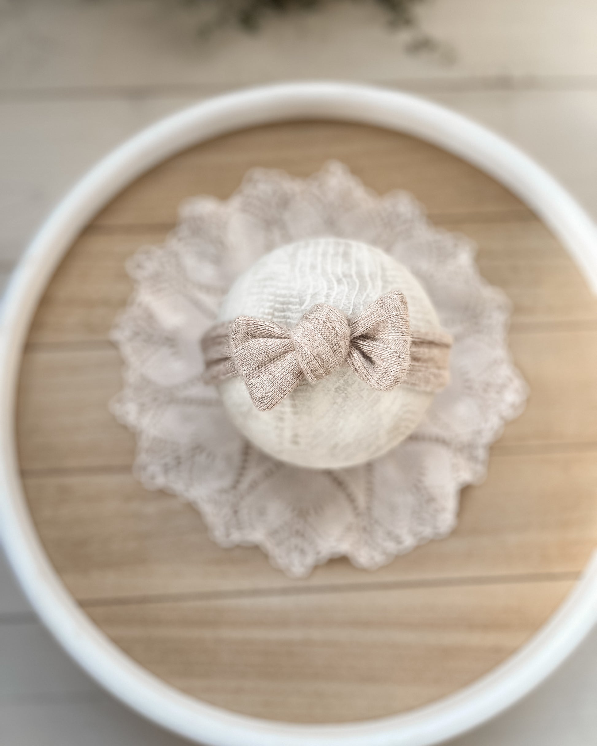Měkký uzlík z přírodní pleteniny působí na snímcích mile a nerušeně. Doladí kompozici, sjednotí styling a jemně zvýrazní obličej miminka, aniž by přitahoval příliš pozornosti.