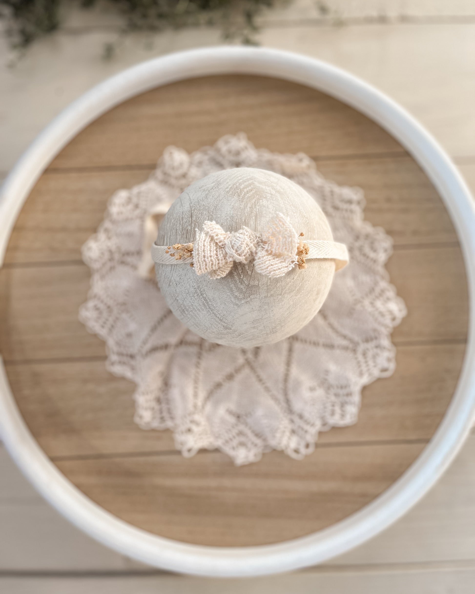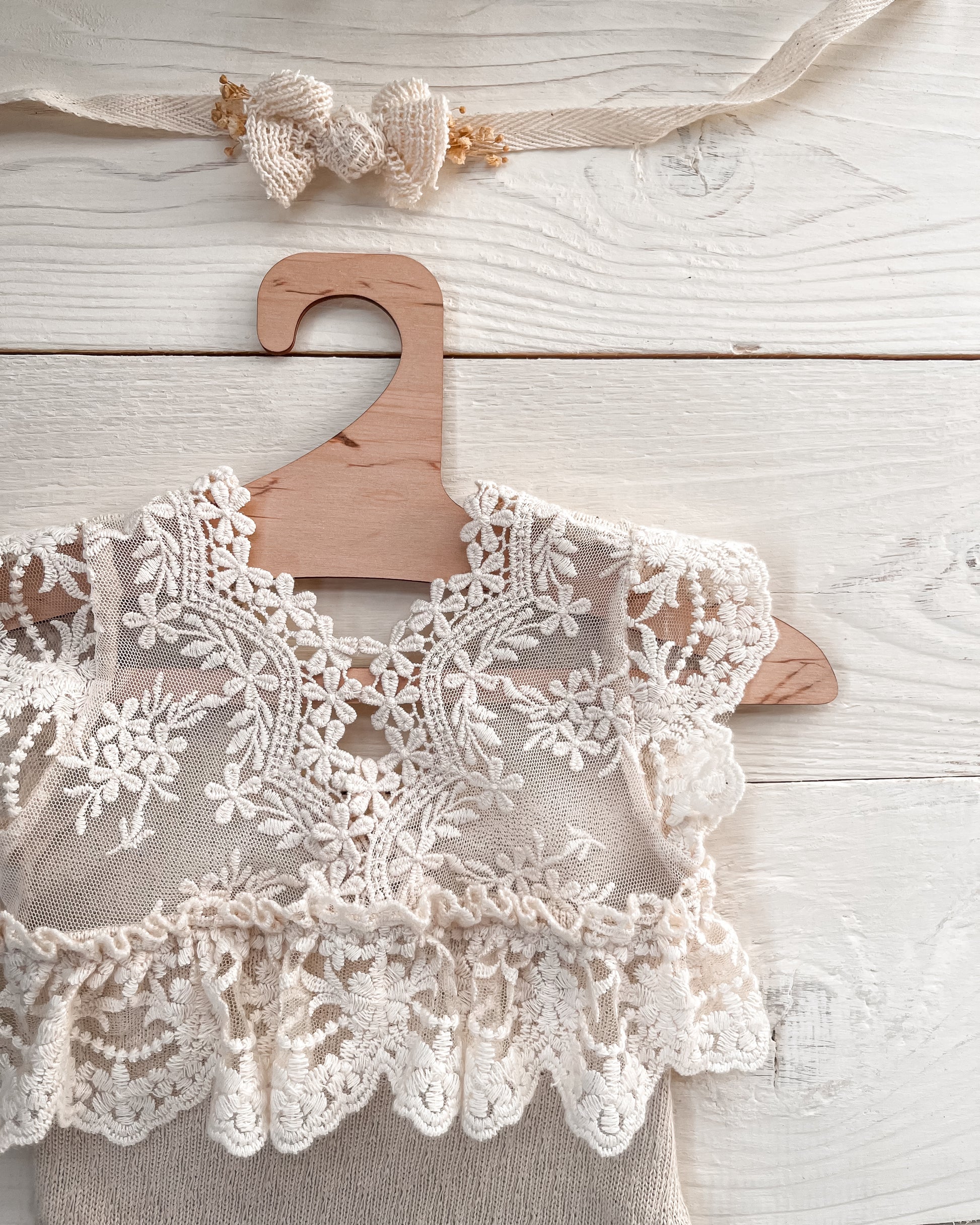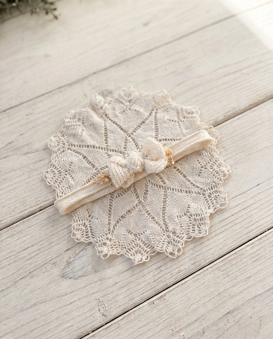 Jemná mašlička z přírodní krajky doplněná o drobné kvítky a texturu v odstínu ivory dodává fotkám kouzlo, které působí neokázale a přirozeně ✨