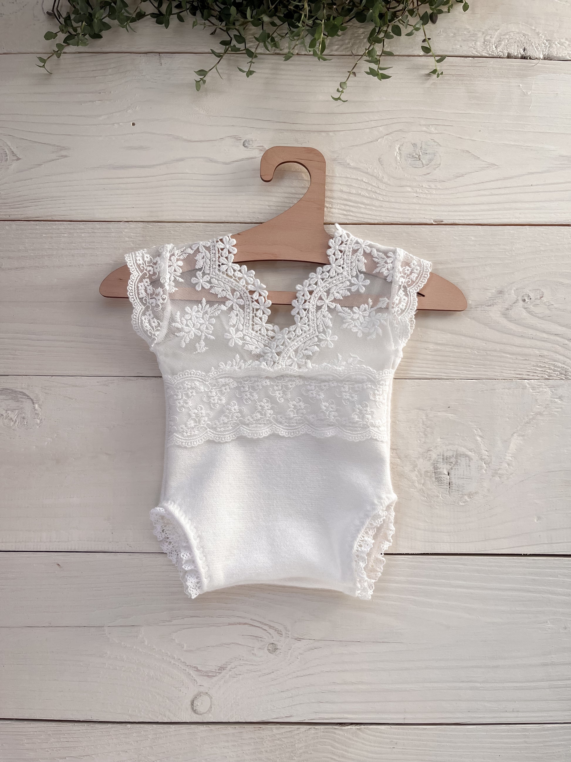 Jemný krajkový výstřih zvýrazní obličej miminka, zatímco krátký krajkový rukávek působí roztomile a decentně.
