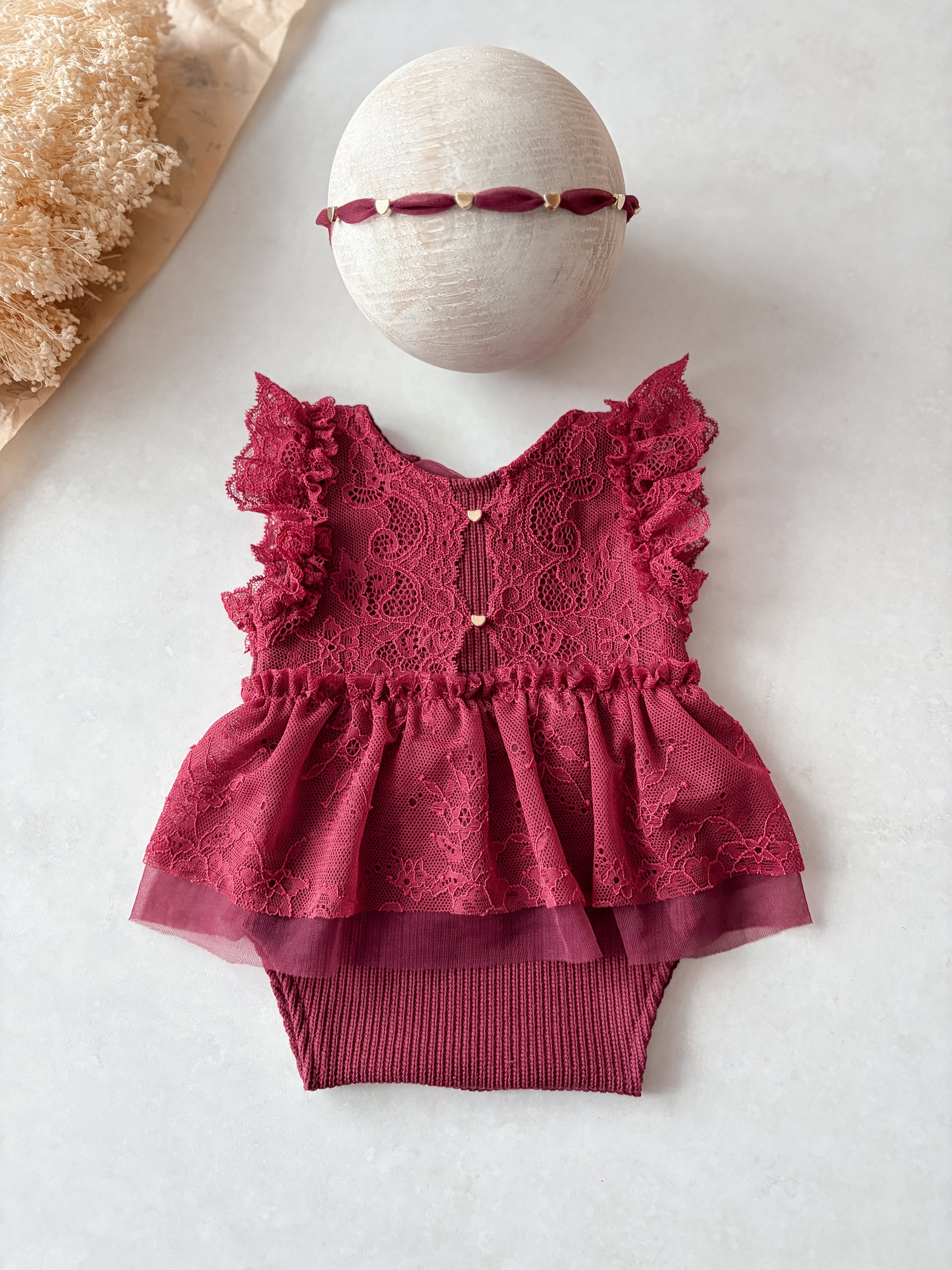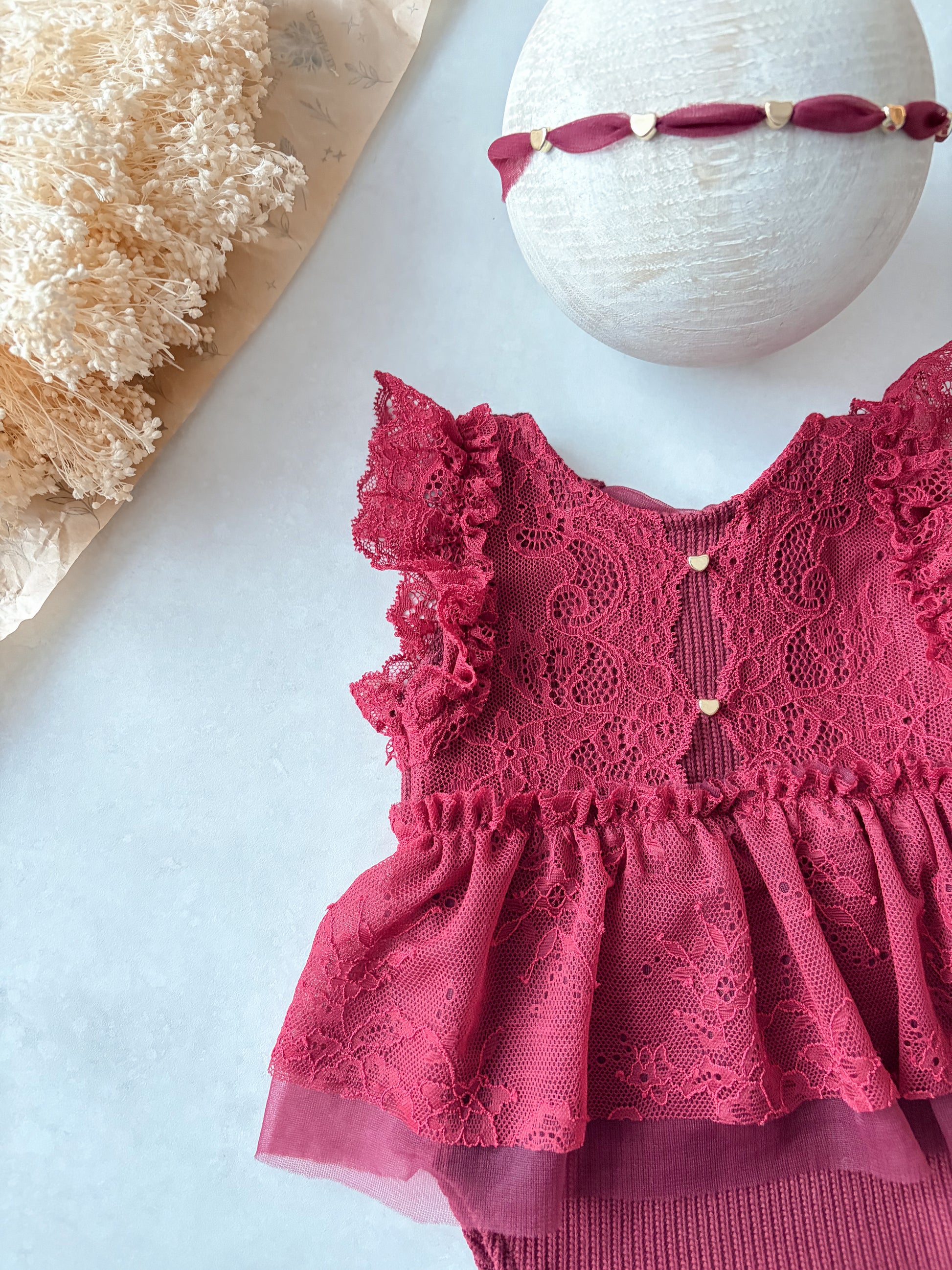 Minimalistický doplněk navržený pro dokonalé sladění s vínovou kolekcí. Čelenka sází na čisté linie a drobné detaily, které neruší kompozici newborn portrétu.