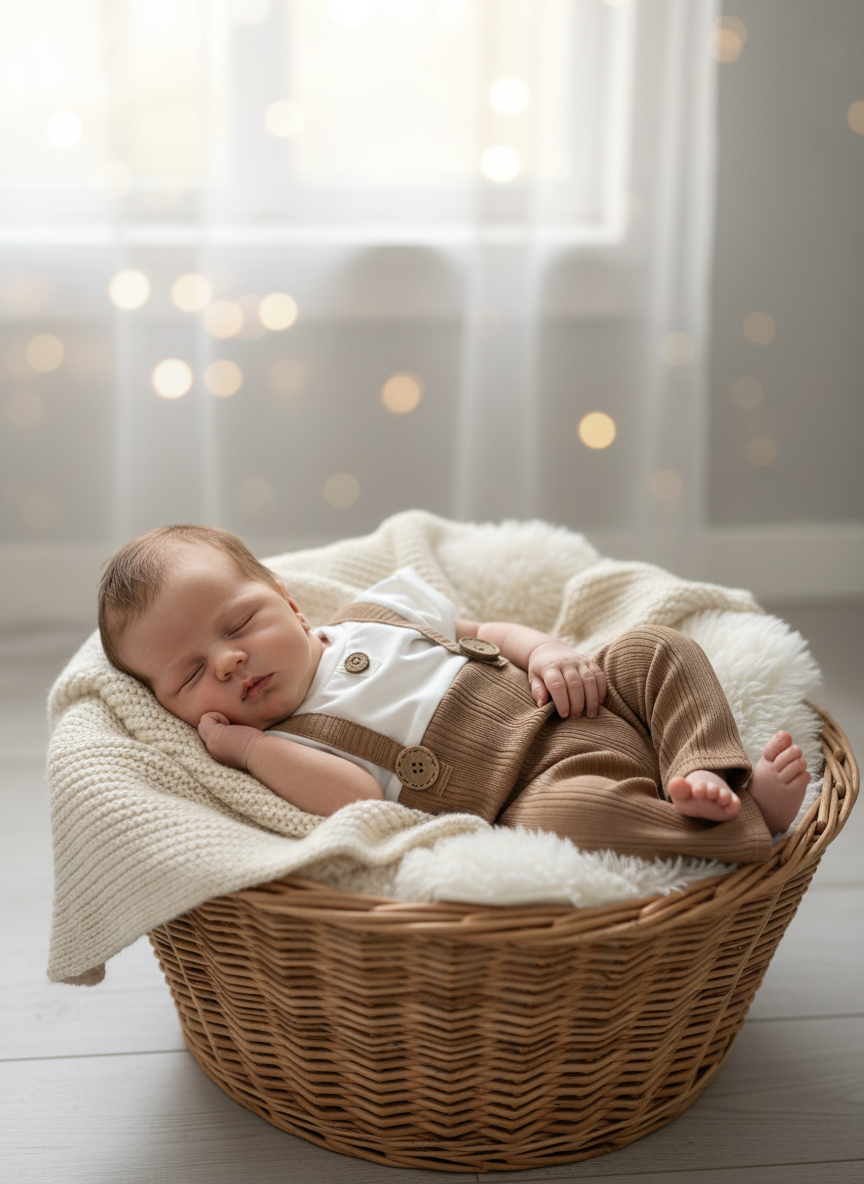 Elastický overalek s designovými laclíky a knoflíčkem je vhodný pro první novorozenecké focení, které si na fotografiích zamilují všechny maminky malých chlapečků. Můžete ho doplnit stylovou bekovkou .